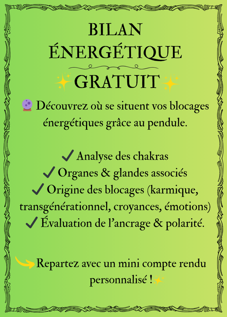 Je t’offre un bilan énergétique gratuit pour mettre en lumière les zones de déséquilibre (chakras, organes, croyances, émotions…).